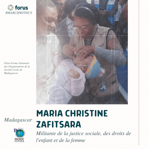 Vous écoutez une édition spéciale de "Un espace pour nous", notre campagne annuelle Marche Avec Nous sur les activistes qui œuvrent chaque jour pour que les droits de tous et toutes soient respectés. Aujourd'hui, avec Zafitsara Maria nous parlons des luttes et des victoires des femmes au #Madagascar. Cet épisode a été réalisé en partenariat avec la PFNOSCM - Plateforme Nationale des Organisations de la Société Civile de Madagascar, membre de Forus.