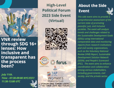 The proposed side-event aims at providing a comprehensive diagnosis of the status, identifying gaps and opportunities for improvement in promoting peaceful, just, and inclusive societies and to identify areas where more resources, policies, or actions are needed to achieve progress towards these targets by looking at the trends and challenges to SDGs through international comparative data and monitoring reports by research institutions and CSOs such as Voluntary National Review (VNR) Report, Sustainable Development Solution Network (SDSN), People’s Scorecard(PSC), etc.